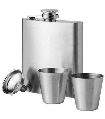 Фляга в наборі з двома рюмками та лійкою запаковані в подарунковій коробці. Виготовлено з нержавіючої сталі. Фляга одностінна. Обладнана кришкою з тримачем.