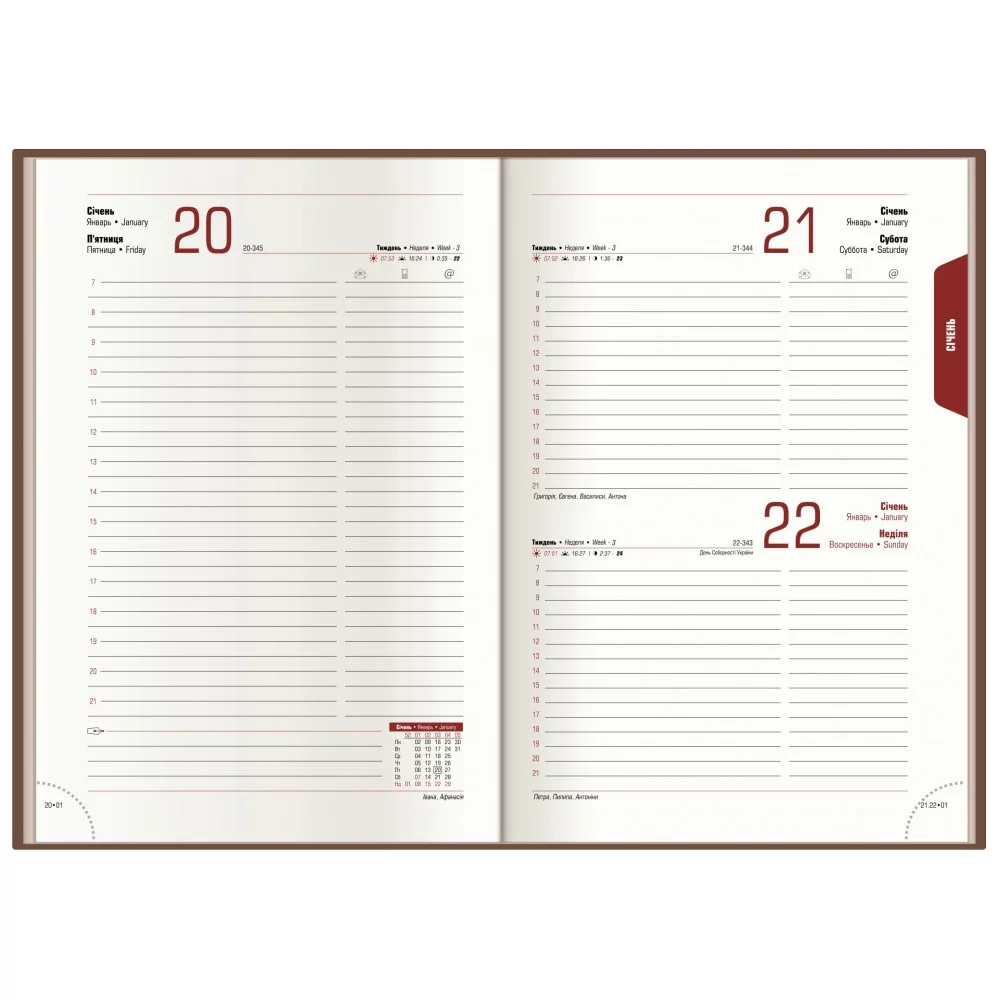 Щоденник Vivella містить 352 розмічені сторінки білого кольору. Обкладинка-щільний кожзам. На ній можна виконати принт методом класичного тиснення або сучасної УФ-печаткою. Такий щоденник стане гідним бізнес сувеніром вашої організації.