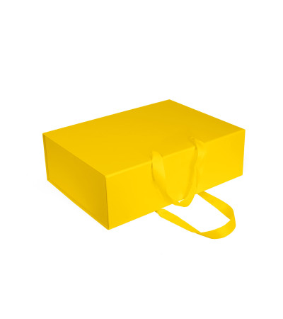 Коробка складна з твердого, переплетеного картону, з двома ручками, вкрита дизайнерським папером. Кришка на магнітах