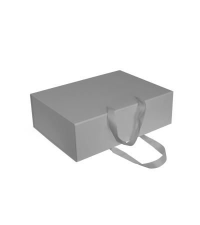 Коробка складна з твердого, переплетеного картону, з двома ручками, вкрита дизайнерським папером. Кришка на магнітах